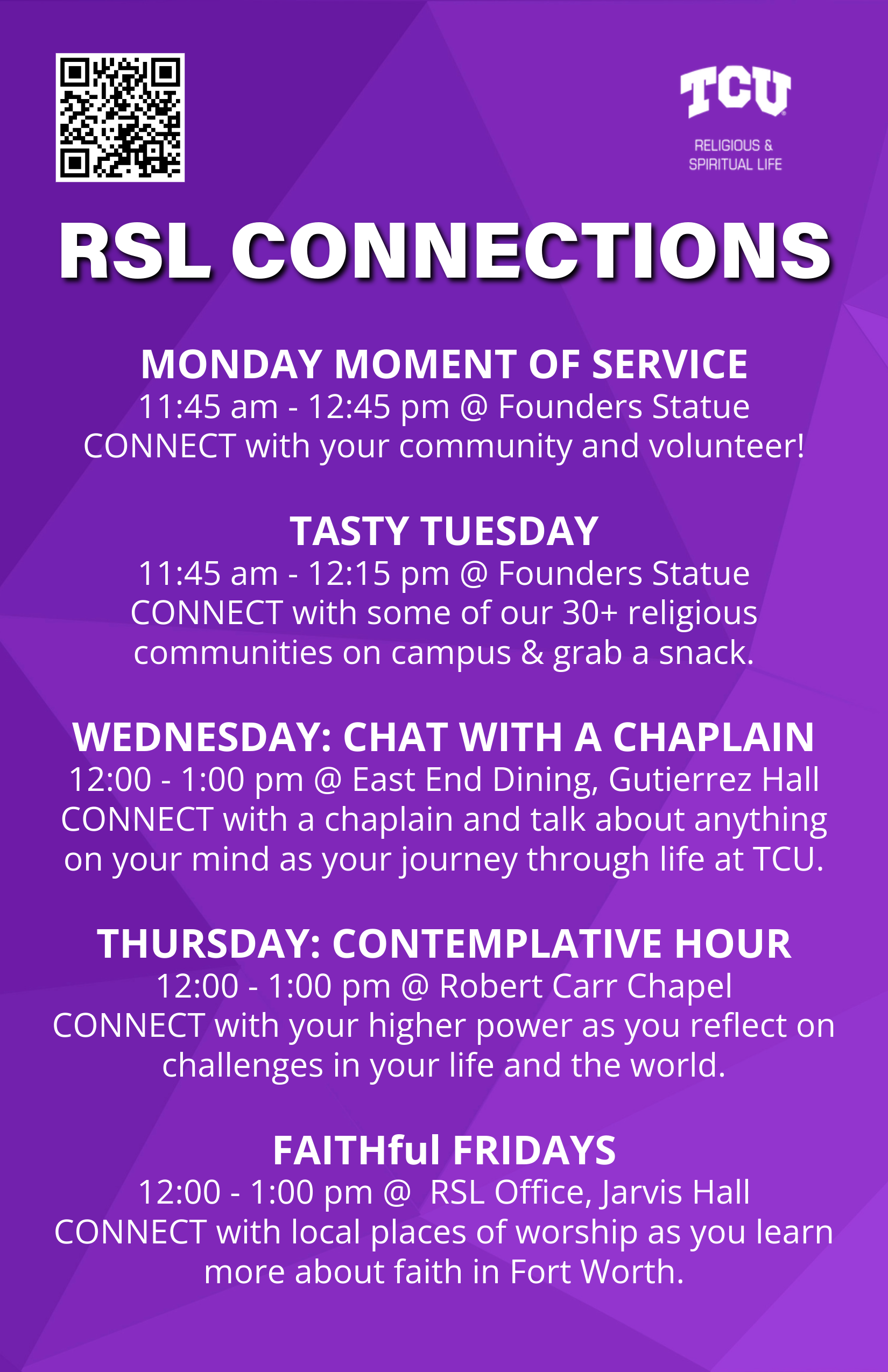 For more information on the Religious Advisory Council and/or TCU’s Interfaith Initiative, please email Rev. Lea McCracken at lea.mccracken@tcu.edu